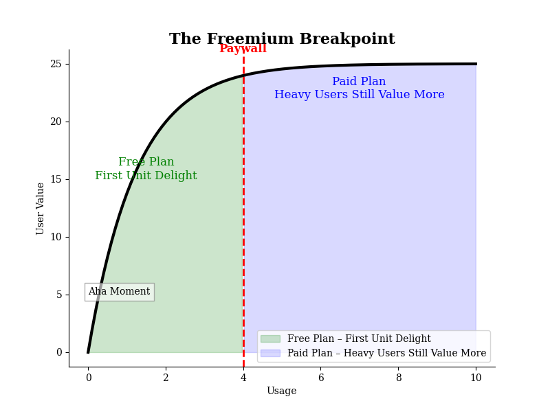 Thesis: Freemium works when the free plan delivers the first unit of value — the steep part of the curve where users get hooked. The paywall should sit just before utility starts to flatten for heavy users. That is where people are most willing to pay for the next unit.